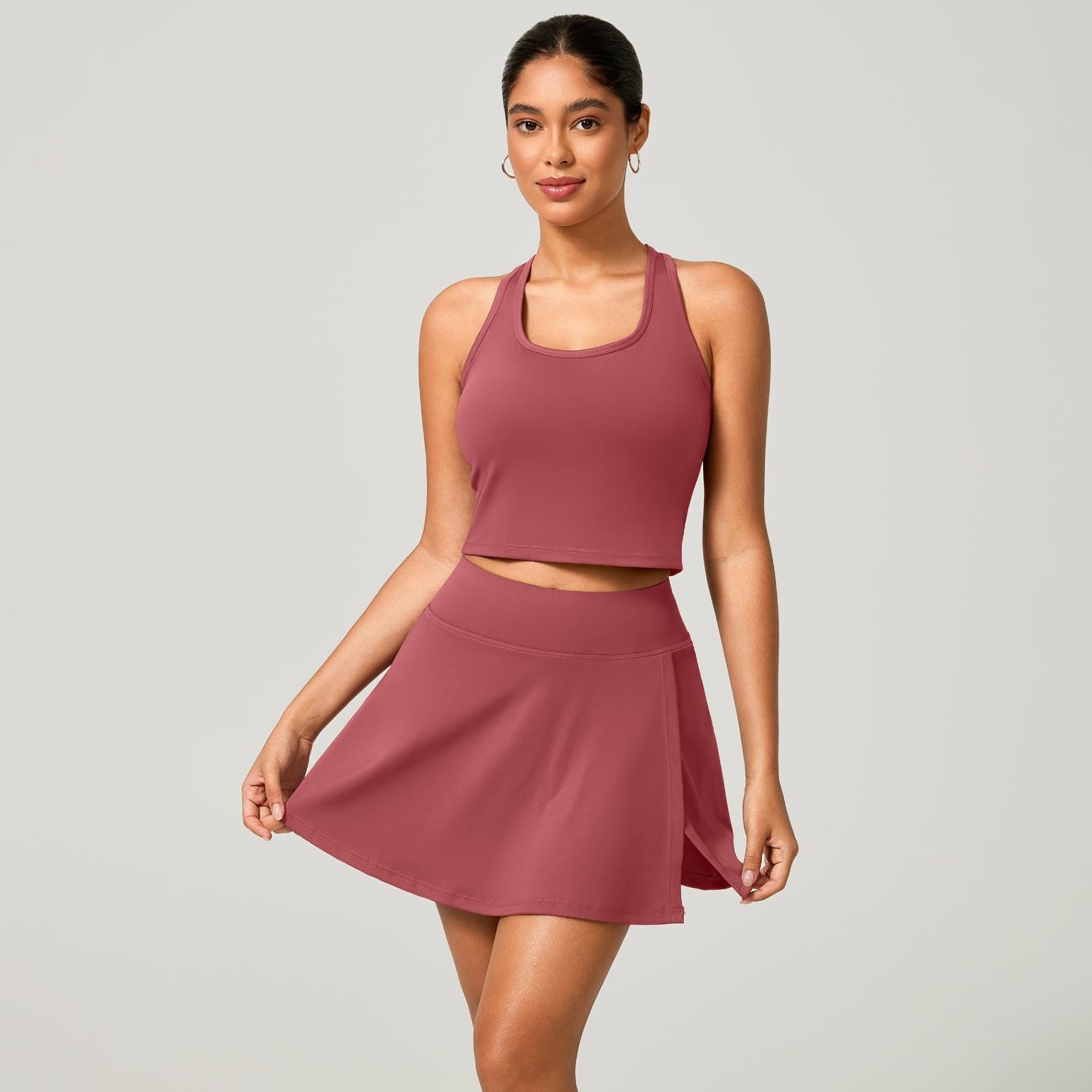 O short saia traz um visual moderno e feminino, com short interno embutido para mais segurança e conforto. Conta ainda com bolso interno funcional, ideal para guardar celular, chave ou pequenos itens. Já o top nadador garante ótima sustentação, firmeza e mobilidade durante os exercícios.